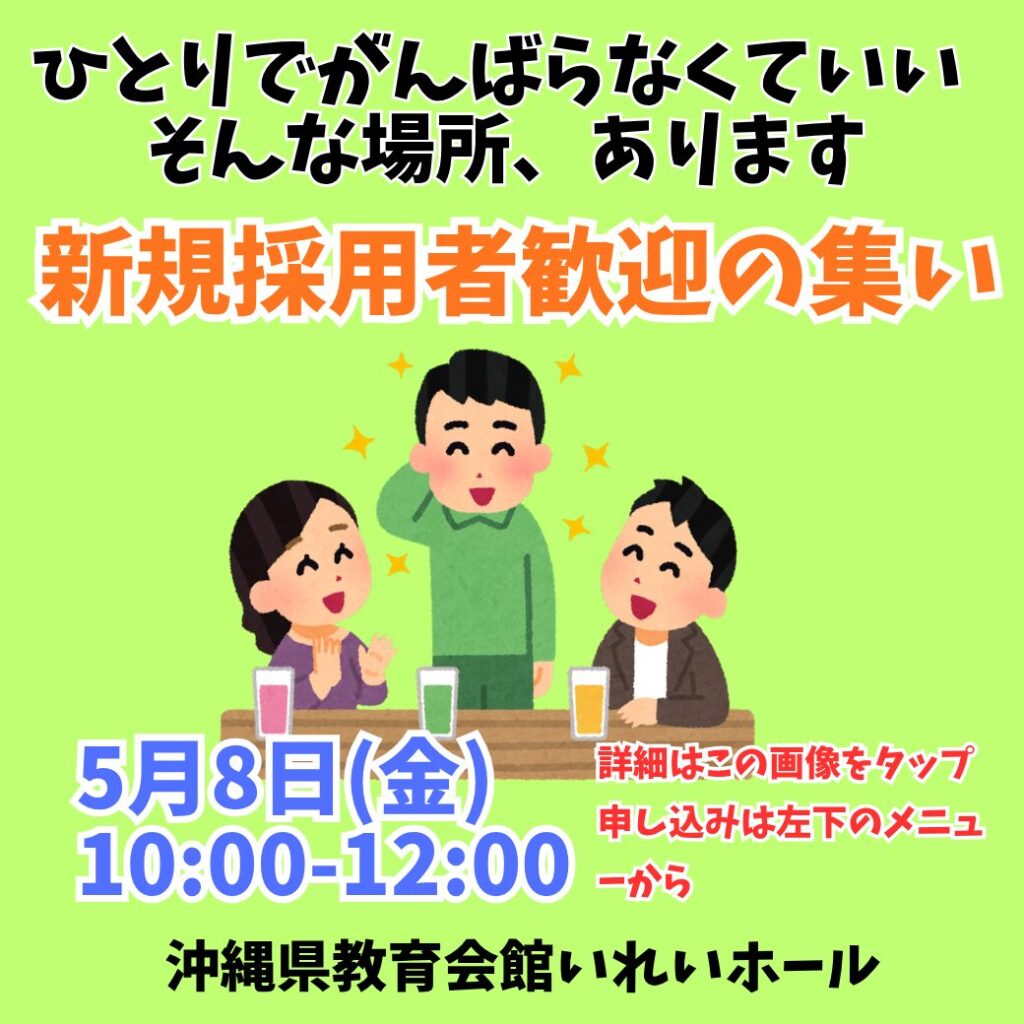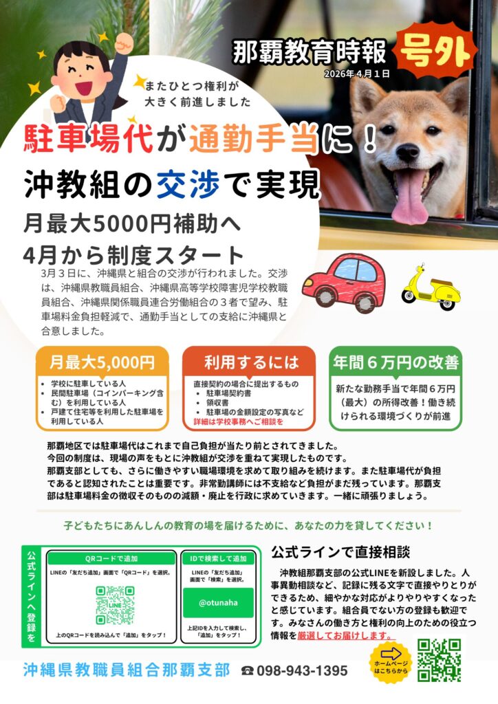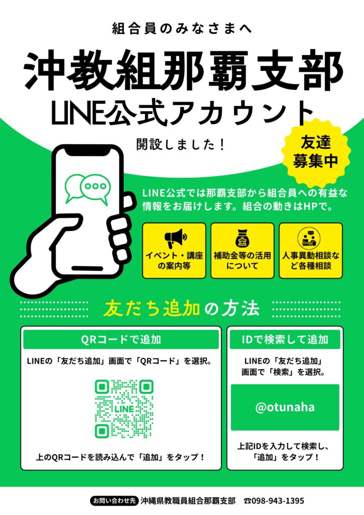 那覇支部には、「書記長」が学校を休職して、「専従」として常駐しています。委員長や、副委員長、執行役員は学校現場にいます。ぜひ、困りごとがある際にはお近くの役員も御頼りください。