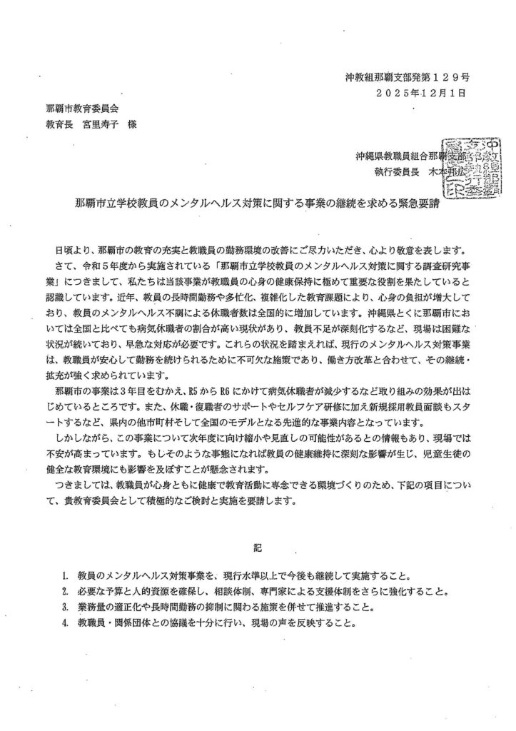 沖教組本部委員長の森岡稔氏と沖教組那覇支部の永山覚書記長は12月1日、那覇教育委員会を訪れ、文科省から委託された教職員のメンタルヘルス対策事業の予算が今年度で終了することから、教職員への相談対応など、取り組んできた事業は市単独でも継続するよう求め、要請文を手渡しました。以下、その要請文です。