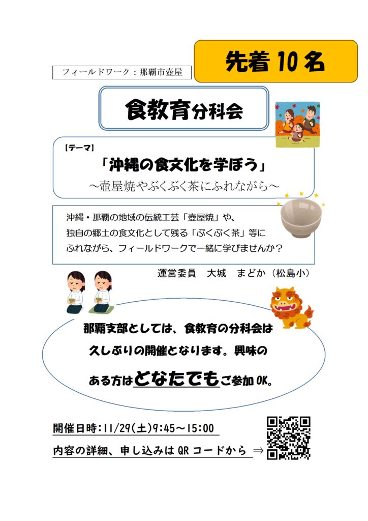 沖縄の食文化を学ぼう! 那覇支部教研集会分科会 2025 11/21 お知らせ 2025年11月17日2025年11月21日 沖縄県教職員組合那覇支部の分科会です。栄養職員部を中心に開催しますが、どなたでも参加可能です。未組合員や一般の方もご参加ください。 お知らせ よかったらシェアしてね! URLをコピーしました! ヨガ講座のお知らせ 【コラム】不登校支援と「不登校休暇」 関連記事 断水の影響について 2025年11月25日 【11月25】国語講座のお知らせ 2025年11月21日 ヨガ講座のお知らせ 2025年11月15日 「賀数仁然さんと学ぶ郷土史」講演会のお知らせ 2024年5月27日 教育研究集会全体会「ウクライナを通して見る平和」明日開催です 2023年12月8日 第70次教育研究中央集会に参加しませんか 2023年10月11日 人事異動個別相談受付はじまってます 2023年10月11日 人事異動相談の受付が10月10日にはじまります 2023年10月7日 コメント コメントする コメントをキャンセルコメント ※ 名前 ※ メール ※ サイト 次回のコメントで使用するためブラウザーに自分の名前、メールアドレス、サイトを保存する。 Δ