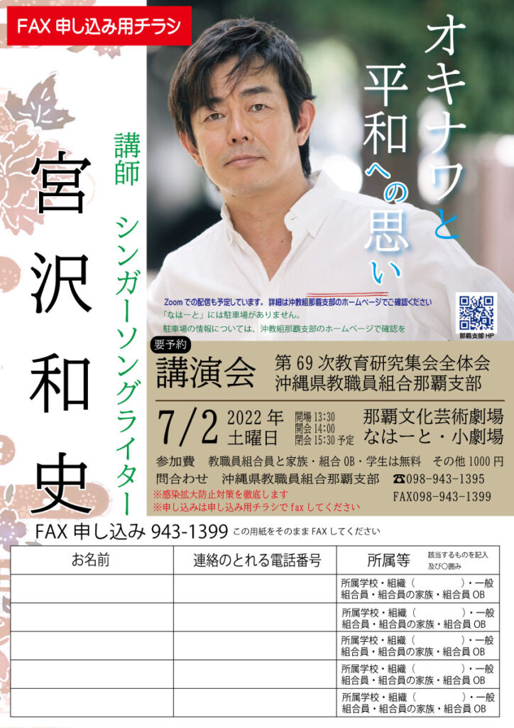 申し込みチラシPDFダウンロード 7月2日の宮沢和史講演会の申し込み用チラシができました。 ダウンロードしてご記入の上、沖教組那覇支部までFAXしてください 組合員を優先して受け付けますので、参加の可否についてご連絡する場合があることをご了承くだ... -